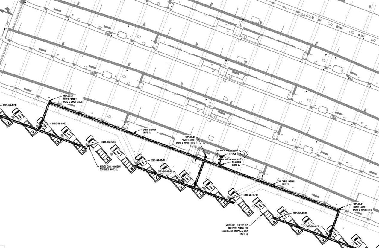 To provide charging for the new electric fleet additions, EV charging infrastructure will be added to the 18 existing bus layover bays, which currently provide short-term daytime parking for diesel vehicles.